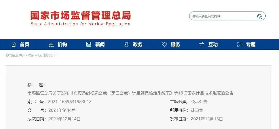 2021年12月14日,國家市場監(jiān)督管理總局發(fā)布實(shí)施《漫透射視覺密度(黑白密度)計(jì)量器具檢定系統(tǒng)表》等19項(xiàng)國家計(jì)量技術(shù)規(guī)范的公告,上海嘉鵬科技有限公司(簡稱“嘉鵬科技”)參編的《JJF1936-2021紫外分析儀校準(zhǔn)規(guī)范》在本次公告規(guī)范之列。